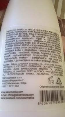 Mleko za telo je lepe kremaste teksture, bele boje i predivnog argan mirisa koji meni izuzetno prija i odgovara. uhvatila sam sebe da zadnjih godinu dana sve što sadrži argan u sastavu meni godi, prija i koži , kosi i čulu mirisa. Lepo se razmazuje, jako lako i brzo upija ako imate suvu kožu kao ja pogotovo, koža je baršunasta, meka i mirisna. Ono što je još bitnije izuzetno je hidrirana i osvežena i posle pola tubice već primetno sjajnija.